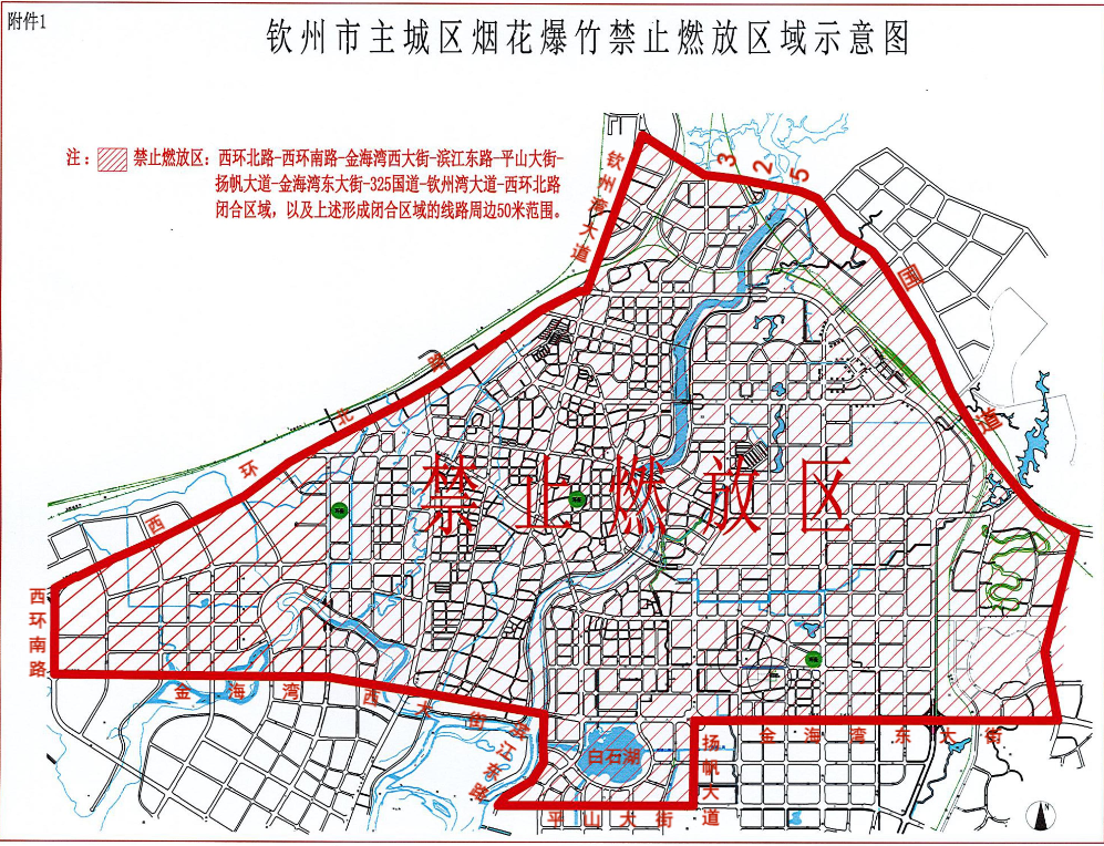 1.主城区。西环北路-西环南路-金海湾西大街-滨江东路-平山大街-扬帆大道-金海湾东大街-325国道-钦州湾大道-西环北路闭合区域,以及上述形成闭合区域的线路周边50米范围为禁止燃放区域。