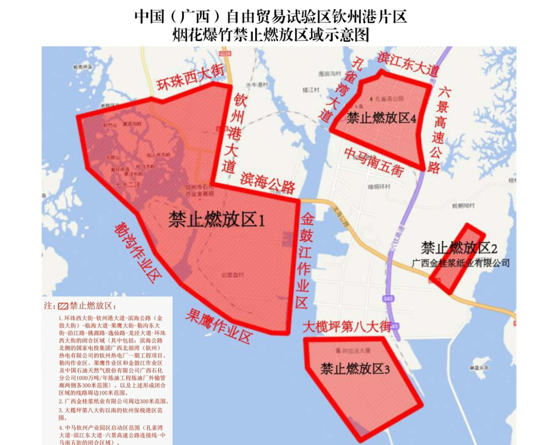 2.中国(广西)自由贸易试验区钦州港片区。(1)环珠西大街-钦州港大道-滨海公路(金鼓大街)-临海大道-果鹰大街-勒沟东大街-沿江路-桃源路-逸仙路-龙泾大道-环珠西大街的闭合区域〔其中包括:滨海公路北侧的国家电投集团广西北部湾(钦州)热电有限公司的钦州热电厂一期工程项目、勒沟作业区、果鹰作业区、金鼓江作业区及中国石油天然气股份有限公司广西石化分公司1000 万吨/年炼油工程炼油厂外输管廊两侧各 300 米范围〕,以及上述形成闭合区域的线路周边100米范围为禁止燃放区域。(2)广西金桂浆纸业有限公司周边300米范围。(3)大榄坪第八大街以南的钦州保税港区范围。(4)中马钦州产业园区启动区范围(孔雀湾大道-滨江东大道-六景高速公路连接线-中马南五街的闭合区域)。