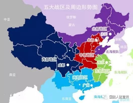 五大战区也是正战区级。东部战区:与原南京军区辖区相同,司令部驻南京,陆军机关驻福州。南部战区:包括原广州军区(除湖北省)和原成都军区的云、贵两省,司令部驻广州,陆军机关驻南宁。西部战区:由原成都军区、兰州军区合并而成(除云、贵、陕三省),司令部驻成都,陆军机关驻兰州。北部战区:辖东三省加内蒙古、山东(即原沈阳军区辖区加内蒙古、山东)司令部驻沈阳,陆军机关驻济南。中部战区:包括现在的北京军区和济南军区,剔去原属北京军区的内蒙古和原属济南军区的山东、加上原属广州军区的湖北和原属兰州军区的陕西,司令部驻北京,陆军机关驻石家庄。
