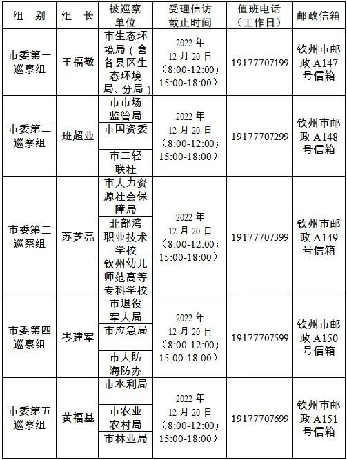 六届钦州市委第三轮巡察进驻一览表